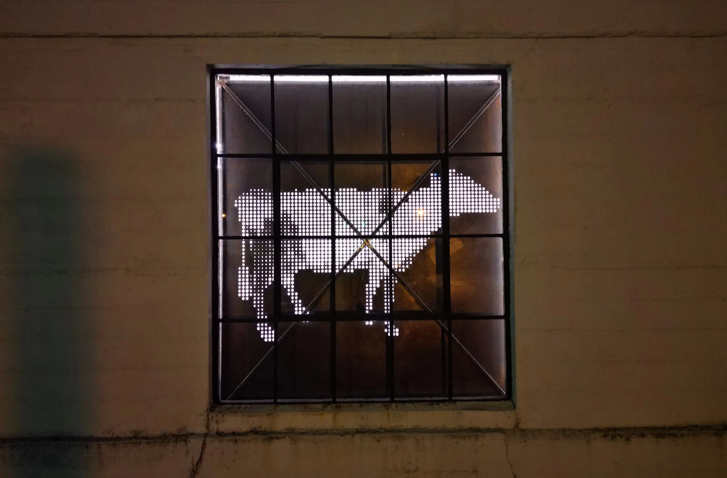 The ten laser-cut portraits of milk cows create glowing projections at particular times of day, and travel across interior surfaces as sunlight passes through them. Each shutter is a laser-cut portrait of a named milk cow being raised by 4H participants in the region. This mother cow is a Holstein Friesian named St. Grimm Dom Vance.